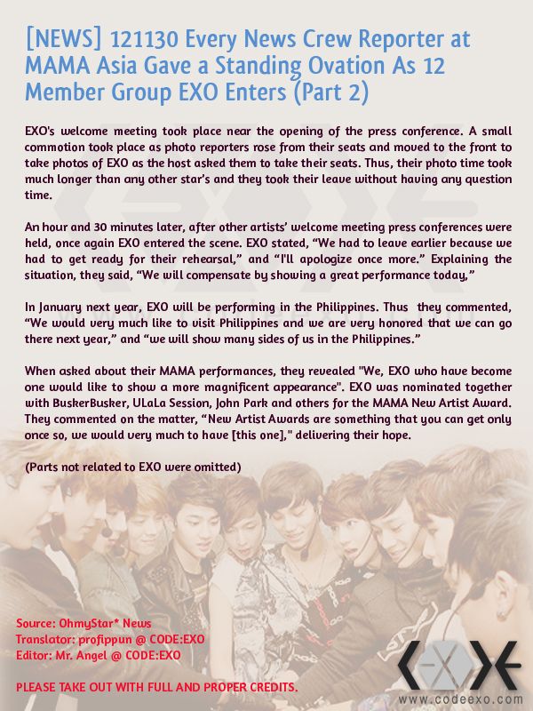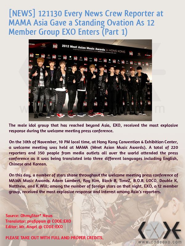 [NEWS] 12.11.30 Every News Crew Reporter at MAMA Asia Gave a Standing Ovation As 12 Member Group EXO Enters